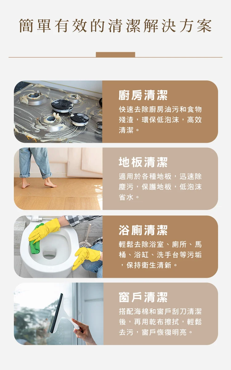 適用於居家各種環境及工具清潔,一瓶輕鬆解決髒污,是清潔最佳的得力助手!