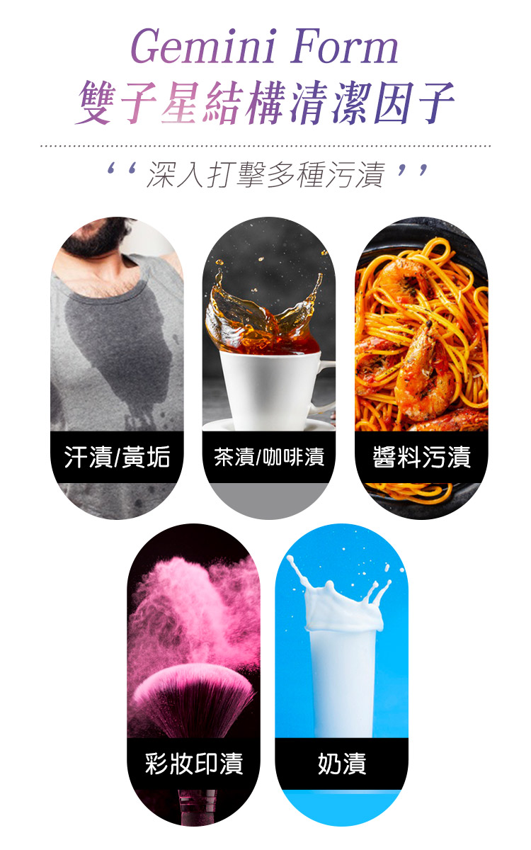 ◉領先市場,獨家採用雙子星結構清潔因子Gemini Form,能同時有效捕捉多種汙垢並增加接觸面積,有效增加130%清潔效能。