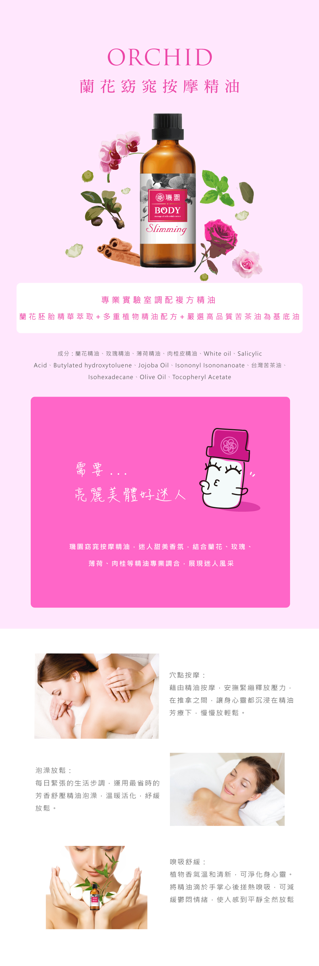 ❀迷人甜美香氛,結合蘭花、玫瑰、薄荷、肉桂等精油專業調和,展現
