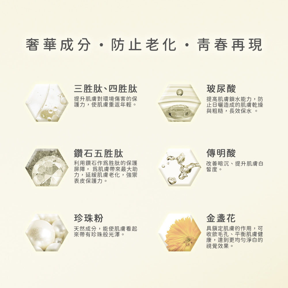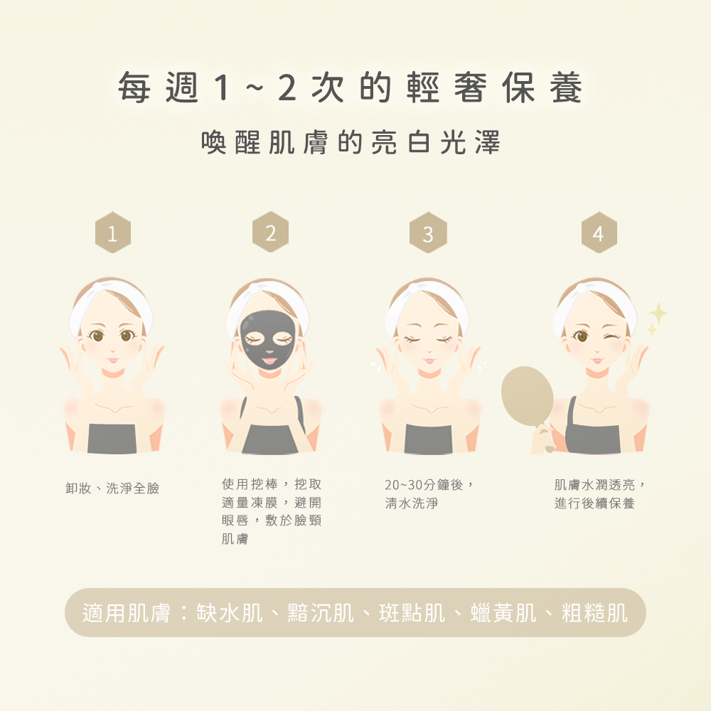 石墨烯 x 鑽石粉 x 珍珠粉極致奢華的頂級成分淬鍊成親膚凍膜 集中密集保養深層潔淨,全面淨化潤澤撫紋,再現澎潤緊緻美白亮顏,肌膚煥采透亮 優雅玫瑰香氣彷若置身富饒天堂帶來愉悅好心情 【產品規格】✦成分:石墨烯、金盞花、玻尿酸、傳明酸、鑽石粉、珍珠粉、三胜肽、四胜肽、五胜肽✦容量:50g✦產地:台灣 【使用方法】每週使用1-2次,臉部清潔後,於臉部、頸部肌膚塗敷一層,待15~20分鐘後,沖洗乾淨,並進行後續保養。