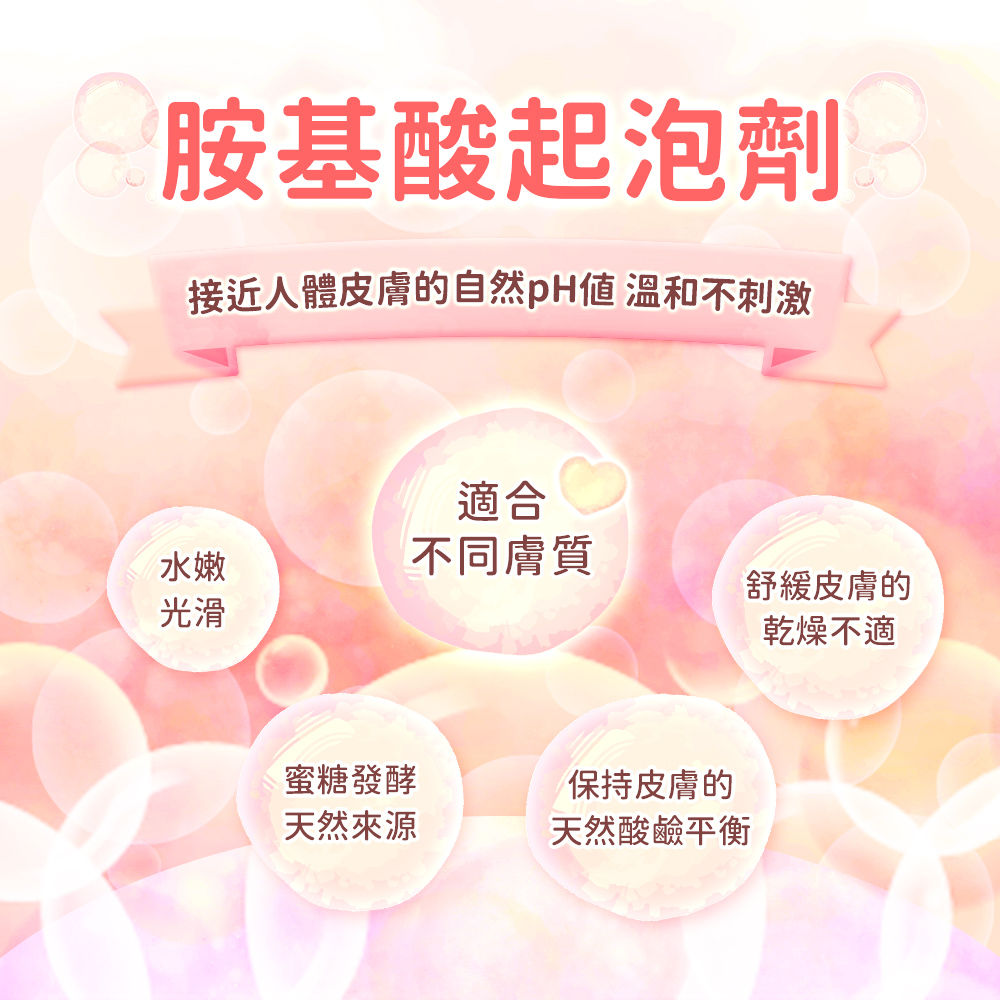 ◉天然蜜糖發酵胺基酸起泡劑,保濕滋潤肌膚,讓膚觸平滑水嫩。