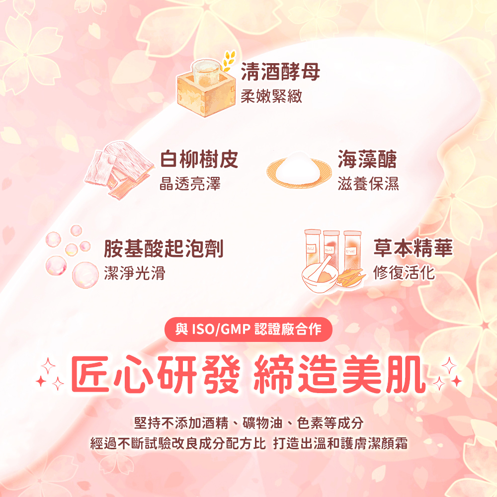 ◉與ISO/GMP認證廠合作研發製造 ,經過不斷試驗改良成分配方比 ,打造出溫和的護膚潔顏霜。