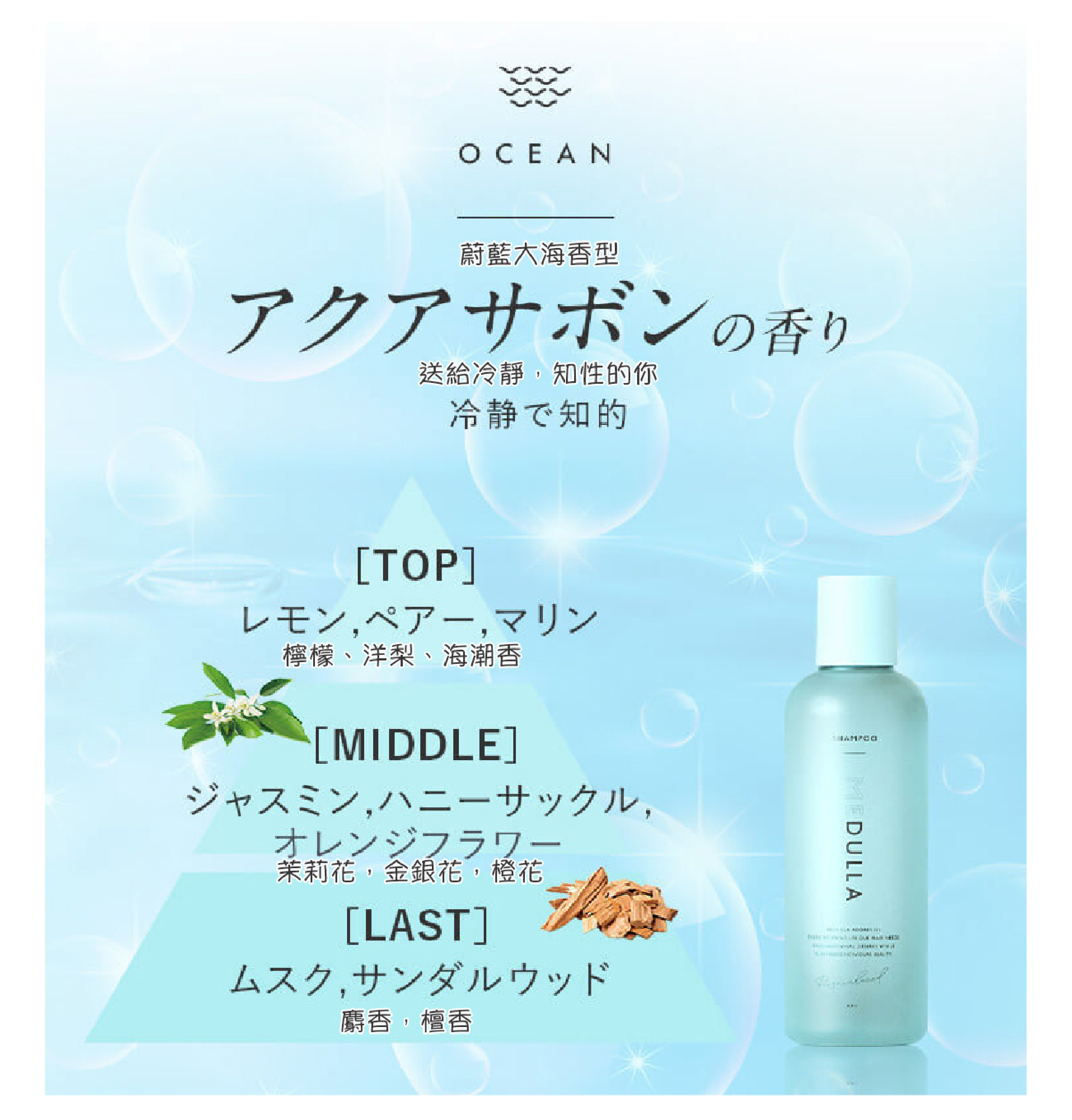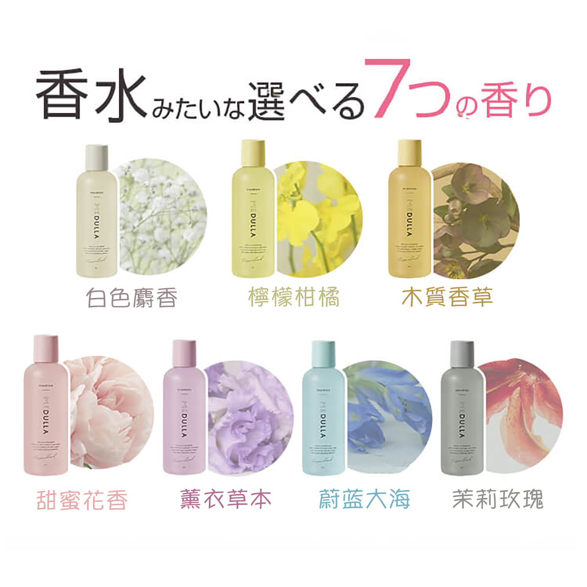 A. 陽光大地 (控油去屑×輕柔滑順) 一般髮質適用 B. 薰衣草本 (高度保濕×修護受損) 一般髮質適用 C. 輕盈閃亮 (光澤柔順×修護受損) 一般髮質適用 D. 蔚藍大海 (控油去屑×輕柔滑順) 一般/油性髮質適用 E. 夜月來香 (控油去屑×輕柔順滑) 一般/油性髮質適用 F. 甜蜜花朵 (高度保濕×修護受損) 一般/乾燥髮質適用 G. 東方美人 (保濕止癢×光澤柔順×修復受損) 一般/乾燥髮質適用