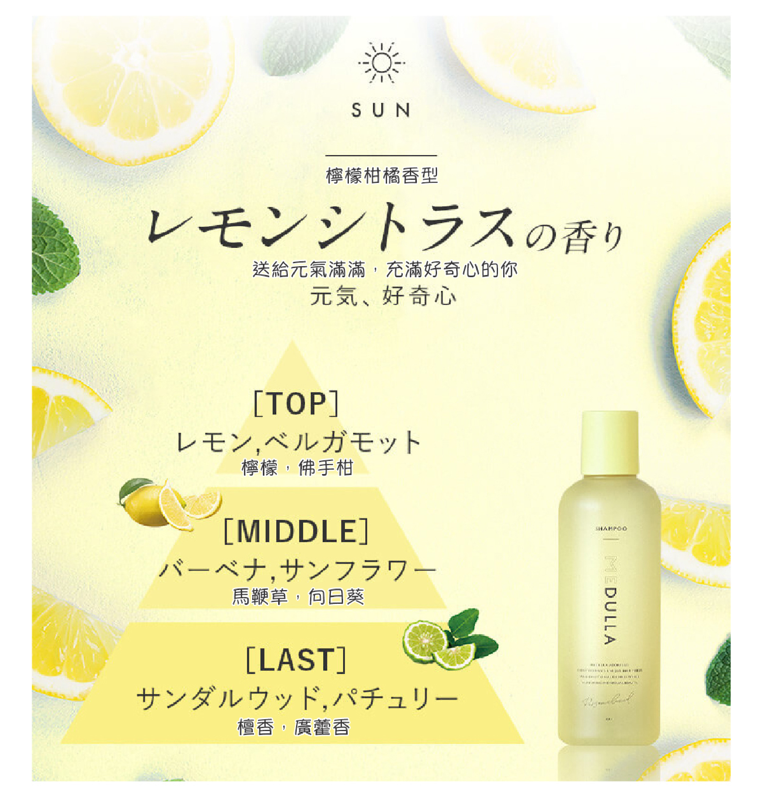 前調-檸檬、佛手柑;中調-馬鞭草、向日葵;後調-檀香、廣藿香