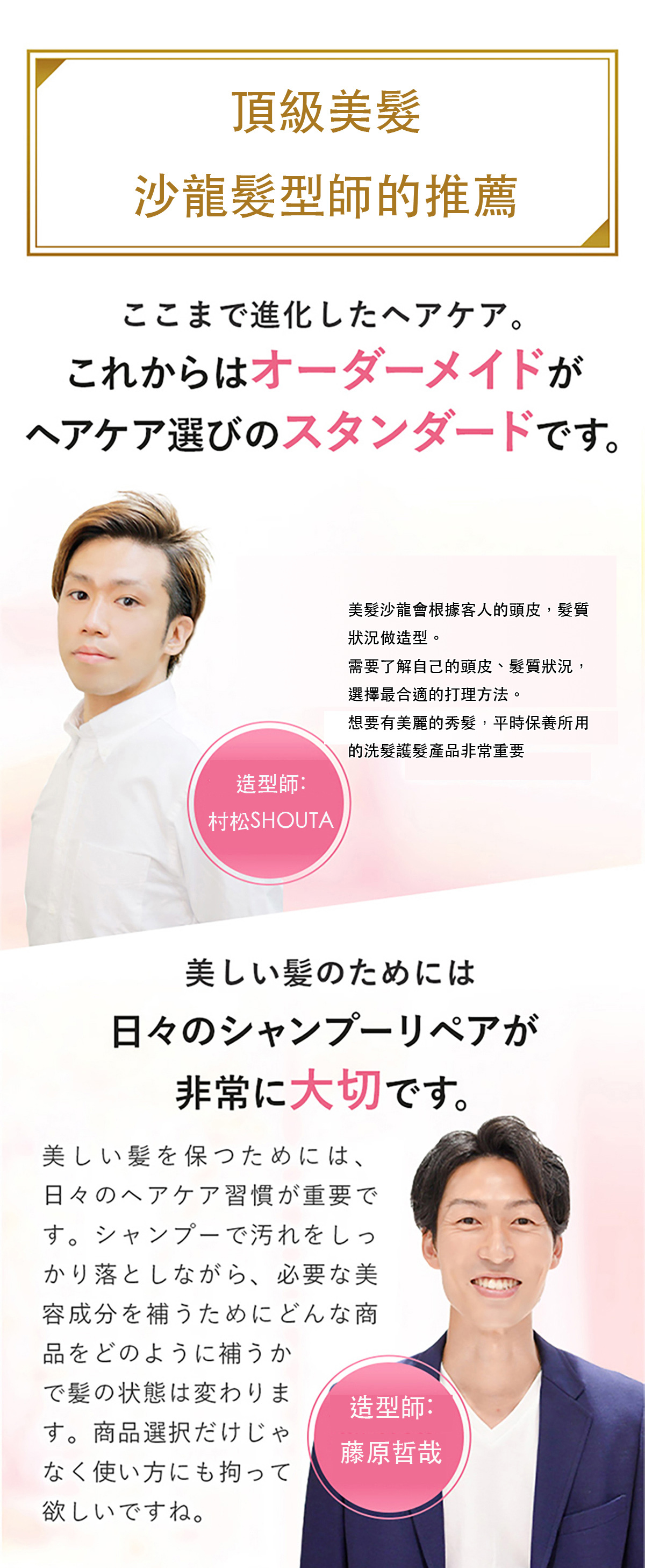 日本頂級客製化髮妝品品牌,除了專業洗髮、護髮配方以外,更重視代表自我的「色彩」與「香味」,讓秀髮在隨風搖曳的同時,展現出妳的『自我原色』、散發獨特魅力!