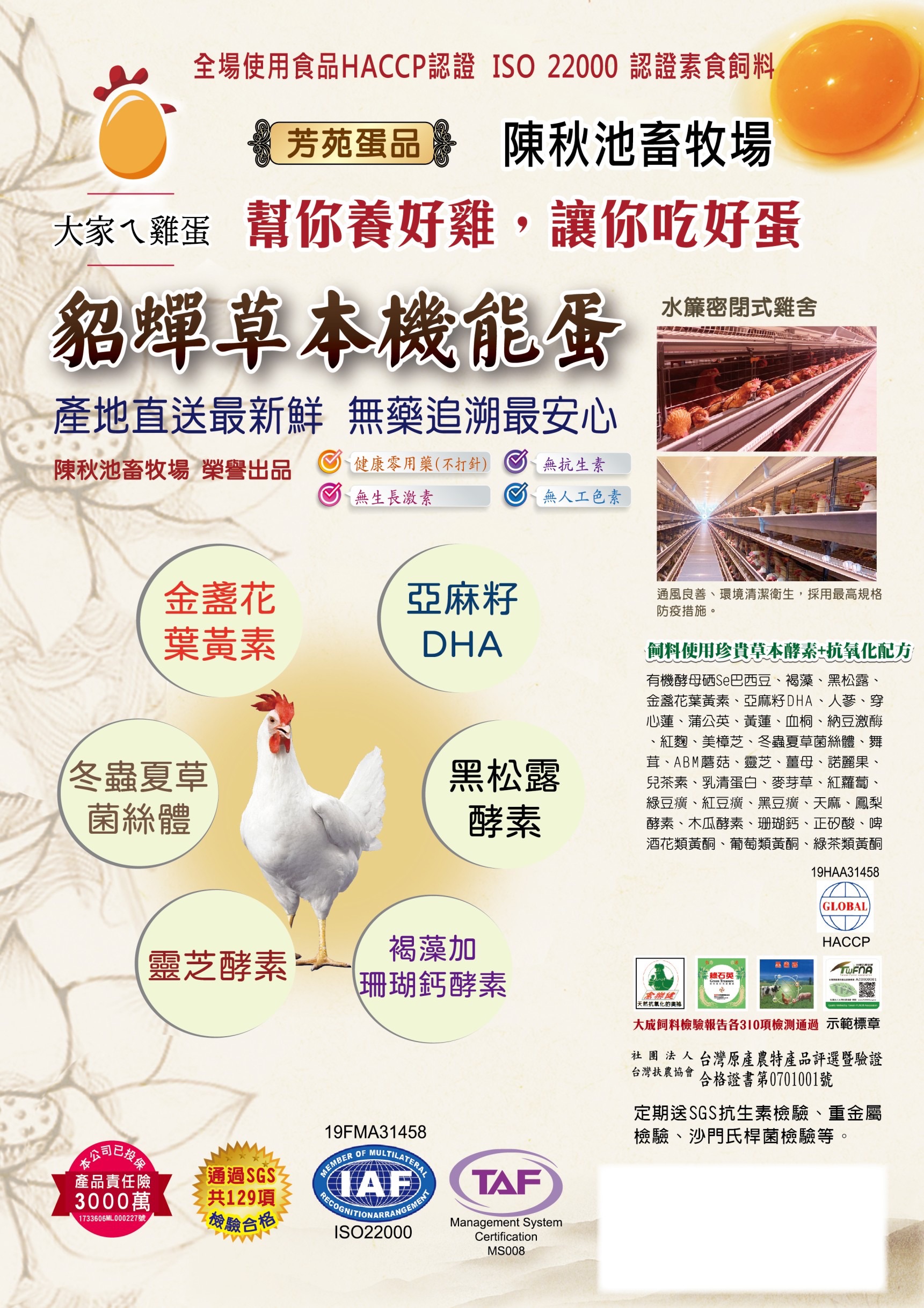 ♕有履歷的A級健康養生蛋,行政院農委會雞蛋溯源編號:5140057515 , 彰化芳宛鄉農會輔導,每三個月自主檢驗通過SGS 1050項檢驗認證,破全國認證紀錄。